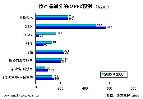 易觀國際預(yù)測2006年全國電信運(yùn)營商的資本總開支為2053億(不包括 3G 資本開支),比2005年下降1%?偟目磥,運(yùn)營商在