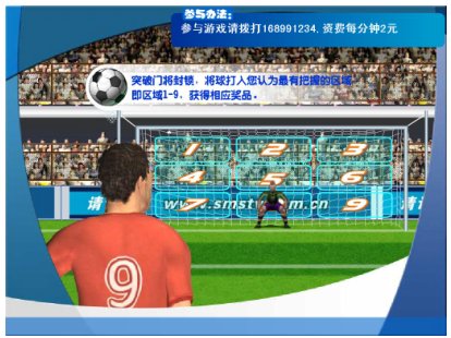 球門分成9個(gè)區(qū)域,分別對(duì)應(yīng)1-9,你要首先搶到射門權(quán),然想要射哪個(gè)區(qū)就按電話機(jī)上對(duì)應(yīng)的1-9號(hào)鍵或直接在手機(jī)上寫短信SM+區(qū)域號(hào)(1-9)發(fā)送到短信號(hào)碼,即可完成一次射門,射中后即可可獲得獎(jiǎng)品。