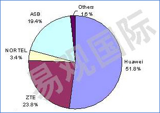 從1997年首次提出NGN概念后,經(jīng)過(guò)長(zhǎng)達(dá)數(shù)年的孕育和完善,全球于2004年進(jìn)入商用部署階段,目前NGN業(yè)務(wù)在全球各地都有廣泛和大規(guī)模的商用。而中國(guó)的運(yùn)營(yíng)商也經(jīng)歷了小規(guī)模試驗(yàn)和測(cè)試、大規(guī)模測(cè)試和試商用、大規(guī)模商用這幾個(gè)階段。圖:中國(guó)NGN市場(chǎng)各設(shè)備廠商市場(chǎng)份額