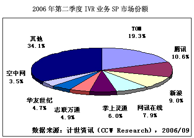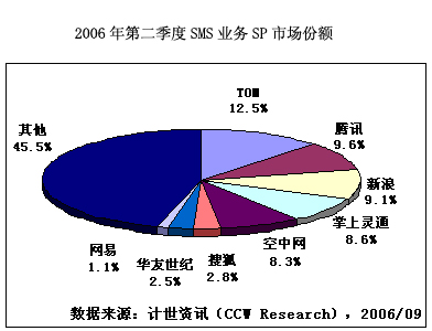 計世資訊(CCW Research)調(diào)研顯示。2006年第二季度,中國SMS業(yè)務市場規(guī)模達到118.3億元人民幣,其中SP收入12.1億元人民幣。TOM、騰訊和新浪排名前三位,分別占12.5%、9.6%和9.1%。其次為掌上靈通和空中網(wǎng),占8.6%和8.3%。計世資訊供稿 CTI論壇編輯