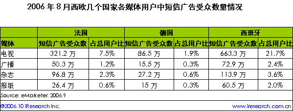 iResearch艾瑞市場咨詢根據(jù)eMarketer資料整理顯示,短信廣告在西歐國家大行其道,成百上千萬的移動用戶訂閱了廣告短信。西歐各國不同媒體訂閱廣告短信的用戶數(shù)不盡相同?傮w上來看,西班牙的短信廣告受眾最多,電視用戶中有21.7%人訂閱了短信廣告,數(shù)量達(dá)663.3萬。相比之下,法國電視用戶中的短信廣告受眾只有西班牙的1/2,德國則更少。http://www.iresearch.com.cn
