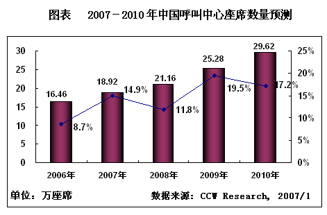 計(jì)世資訊(CCW Research)的研究成果《2006-2007年中國呼叫中心市場(chǎng)研究報(bào)告》預(yù)計(jì),2007-2010年中國呼叫中心的產(chǎn)業(yè)投入規(guī)模平均年度復(fù)合增長率將超過20%,預(yù)計(jì)2007年中國呼叫中心投入規(guī)模將達(dá)到337.19億元,同比增長24.8%。由于2007、2009兩個(gè)年度中國呼叫中心將開始更換新的系統(tǒng)平臺(tái),并開拓遠(yuǎn)程座席市場(chǎng),因此2007年的呼叫中心座席規(guī)模增長率高于2006年,2009年的呼叫中心座席規(guī)模增長率高于2008年。預(yù)計(jì)2007年中國呼叫中心座席數(shù)量將達(dá)到18.92萬個(gè),同比增長14.9%;而2006年呼叫中心座席數(shù)量的同比增長率僅僅是8.7%,可見2007年的增長率比2006年的高出6.2個(gè)百分點(diǎn)。計(jì)世資訊(CCW Research)研究認(rèn)為,2007年成為中國呼叫中心產(chǎn)業(yè)發(fā)展的轉(zhuǎn)折點(diǎn),2007年中國開始進(jìn)入第二波呼叫中心建設(shè)高潮期。