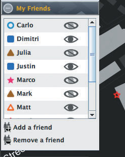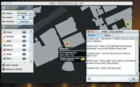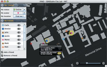 該軟件名為iFind,乍一看類似任何典型的即時(shí)通信軟件,也需要雙方相互邀請(qǐng),這樣才能進(jìn)入對(duì)方的好友名單。用戶可以選擇暫時(shí)隱藏起來(lái),不讓某個(gè)好友或者整個(gè)群組看見自己,他們還可以完全把某人從好友名單中刪除。不過(guò)iFind的好友名單增加了地圖,可以實(shí)時(shí)顯示這些朋友在MIT校園的哪個(gè)角落。地圖顯示了通過(guò)Wi-Fi登錄到MIT網(wǎng)絡(luò)上的好友,讓用戶可以為每個(gè)朋友創(chuàng)建獨(dú)特的迷你頭像,能看到誰(shuí)在學(xué)校河邊閑逛、誰(shuí)在樓上圖書館看書。