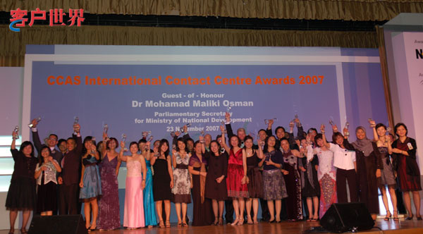 2007年11月23日,新加坡。2007年度國(guó)際呼叫中心大獎(jiǎng)?lì)C獎(jiǎng)典禮今天在新加坡Ritz Carlton酒店隆重舉行;繼2006年首度接軌亞太地區(qū)最佳呼叫中心評(píng)選活動(dòng)之后,中國(guó)呼叫中心行業(yè)協(xié)會(huì)CNCCA再次組團(tuán)出訪(fǎng)獅城新加坡。在本年度國(guó)際最佳呼叫中心評(píng)選的角逐當(dāng)中,來(lái)自中國(guó)的中國(guó)電信深圳分公司10000號(hào)客戶(hù)服務(wù)中心、中國(guó)移動(dòng)通信集團(tuán)廣東有限公司客戶(hù)服務(wù)(廣州)中心、中國(guó)工商銀行電子銀行中心攜手榮膺最佳呼叫中心大獎(jiǎng)。客戶(hù)世界