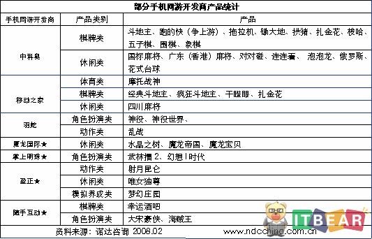目前國(guó)內(nèi)市場(chǎng)上運(yùn)行的手機(jī)網(wǎng)游不下百種,單就手機(jī)網(wǎng)游開放來(lái)說,國(guó)內(nèi)還沒有哪家或哪幾家開發(fā)商控制占據(jù)絕對(duì)優(yōu)勢(shì)的局面。下表列出了幾家手機(jī)網(wǎng)游開發(fā)商開發(fā)的手機(jī)網(wǎng)游產(chǎn)品。從表中可以看出中科奧開發(fā)的產(chǎn)品數(shù)量較多(18款),主要產(chǎn)品為棋牌與休閑類小游戲。其他的開發(fā)商開發(fā)的手機(jī)網(wǎng)游產(chǎn)品數(shù)量在2—5款之間,多為大型游戲。從游戲品種的不同可以看出主要開發(fā)商的研發(fā)方向有所區(qū)別。