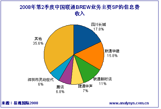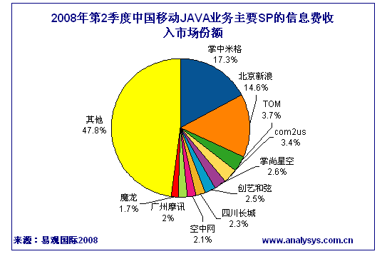 易觀國際近期發(fā)布《2008年第2季度中國手機(jī)游戲市場(chǎng)季度監(jiān)測(cè)》顯示:中國移動(dòng)JAVA業(yè)務(wù)SP信息費(fèi)方面,掌中米格、北京新浪分居前兩名,兩者市場(chǎng)占有率已提高至31.9%。其中掌中米格信息費(fèi)季度收入達(dá)到2505.86萬元,市場(chǎng)占比為17.3%,而新浪信息費(fèi)收入市場(chǎng)占比為14.6%。信息費(fèi)收入的第3至第5名依次為TOM、com2us、掌尚星空,三者總市場(chǎng)占比為9.7%。易觀國際