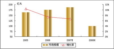 賽迪顧問定義的電信應(yīng)用是指運(yùn)營商、設(shè)備提供商、系統(tǒng)集成商針對各行業(yè)特點提供的電信解決方案和電信服務(wù)。2008年上半年,中國電信行業(yè)應(yīng)用市場規(guī)模達(dá)到99.2億元人民幣,同比增長8.3%。賽迪顧問預(yù)測,2008年全年中國電信行業(yè)應(yīng)用市場規(guī)模將突破200億元,同比增長7.1%,持續(xù)平穩(wěn)增長的趨勢。圖1 2004-2008年中國電信行業(yè)應(yīng)用市場規(guī)模