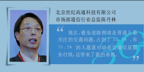 在北京世紀高通科技有限公司市場部通信行業(yè)總監(jiān)陳丹林看來,交通堵塞已經(jīng)成為現(xiàn)代都市的頑疾,而3G的到來給這一問題的解決帶來了新的思路。通信產(chǎn)業(yè)網(wǎng)