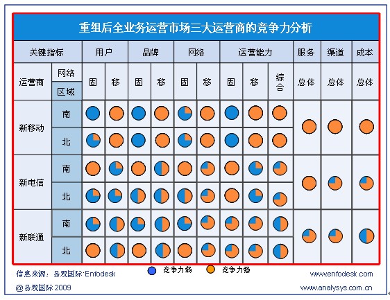 盡管產(chǎn)業(yè)鏈完備程度相差較為明顯,但運(yùn)營(yíng)商各自業(yè)務(wù)與用戶服務(wù)運(yùn)營(yíng)能力對(duì)3G時(shí)常的發(fā)展影響也至關(guān)重要,根據(jù)易觀國際Enfodesk發(fā)布的《國內(nèi)運(yùn)營(yíng)商3G業(yè)務(wù)發(fā)展策略研究系列—中國3G市場(chǎng)現(xiàn)狀與發(fā)展策略概述》報(bào)告顯示,在發(fā)展3G的過程中,三大運(yùn)營(yíng)商各自有一定的優(yōu)劣勢(shì):