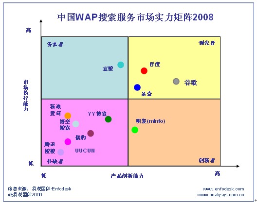 2008年WAP搜索市場(chǎng)中處于務(wù)實(shí)者象限的主要廠商是宜搜。2008年宜搜年收入占整個(gè)WAP搜索市場(chǎng)的36%。這主要?dú)w因于宜搜在整個(gè)2008年在市場(chǎng)推廣和營(yíng)銷(xiāo)方面投入了大量的人力以及資金投入。