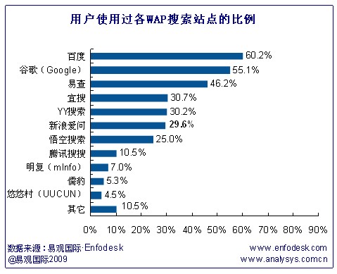據(jù)易觀國際(Analysys International)《中國移動(dòng)搜索市場用戶調(diào)研報(bào)告2009》研究發(fā)現(xiàn)此次調(diào)研樣本用戶使用過的各WAP搜索站點(diǎn)比例情況基本可以分為三個(gè)梯隊(duì):