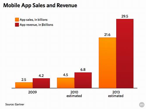 Gartner預計,2010年的應用銷量將達到45億,收入為68億美元。如果蘋果保持現(xiàn)有的速度,即每月銷售2500萬個應用,其全年銷量將達到3億,市場份額為67%。蘋果應用商店2010年的收入則有望達到45億美元,其中蘋果的分成約為13.5億美元,其余則歸開發(fā)者所有。然而,隨著新款iPhone和平板電腦的上市,蘋果有望吸引更多的用戶,從而對應用下載量起到提升作用,市場份額也將有所增加