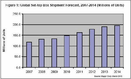 據(jù)iSuppli公司,機頂盒出貨量未來幾年將繼續(xù)增長。消費者收看模式發(fā)生轉變,通過互聯(lián)網(wǎng)提供的電視內(nèi)容越來越流行,從而將為提供商創(chuàng)造條件,在數(shù)字家庭的激烈爭奪中獲得新的營業(yè)收入來源。國際電子商情