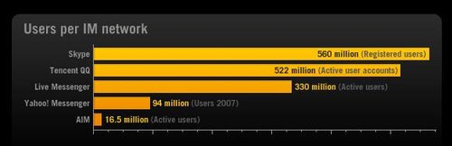 用戶最多的即時(shí)通訊工具包括:Skype(5.6億注冊(cè)用戶)、騰訊QQ(5.22億活躍用戶帳戶)、MSN(3.3億活躍用戶)、雅虎通(9400萬(wàn)用戶--2007年數(shù)據(jù))。
