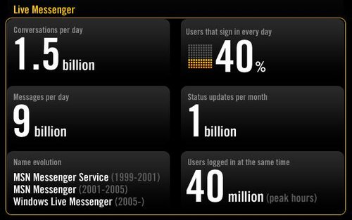 關(guān)于微軟MSN的數(shù)據(jù)為:每天產(chǎn)生的溝通次數(shù)為15億,每天產(chǎn)生的消息為90億條。每月簽名檔消息更新量為10億條。每天都登陸的用戶比例為40%,同時(shí)在線人數(shù)最高值為4000萬(wàn)。
