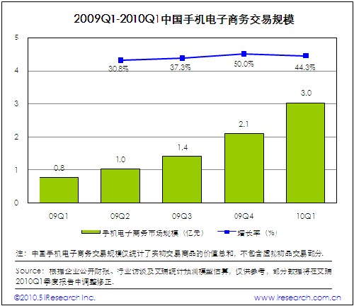 2010Q1中國(guó)移動(dòng)電子商務(wù)實(shí)物交易規(guī)模達(dá)到3.0億元,較2009Q4增長(zhǎng)44.3%,接近09年前三個(gè)季度實(shí)物交易規(guī)模總和。手機(jī)購(gòu)物體驗(yàn)不斷改善,用戶活躍度和付費(fèi)意愿增加,促進(jìn)訂單量大幅增加以及客單價(jià)上升,是本季度手機(jī)購(gòu)物交易規(guī)?焖僭鲩L(zhǎng)的重要原因。淘寶、當(dāng)當(dāng)和卓越等傳統(tǒng)電子商務(wù)企業(yè)推動(dòng)手機(jī)購(gòu)物市場(chǎng)快速發(fā)展,用戶通過(guò)手機(jī)購(gòu)物習(xí)慣培養(yǎng)是手機(jī)電子商務(wù)企業(yè)開(kāi)展的重點(diǎn)工作。艾瑞預(yù)測(cè)今年實(shí)物交易規(guī)模將保持高速增長(zhǎng)態(tài)勢(shì),市場(chǎng)活躍度將進(jìn)一步提高。
