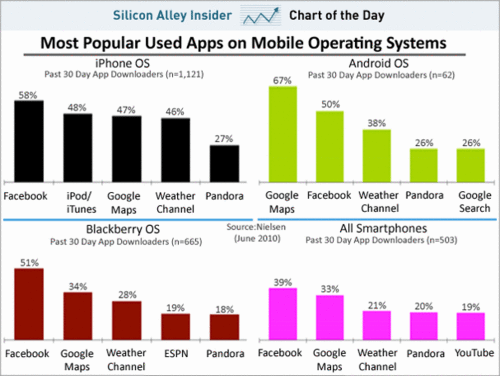 6月11日消息,據(jù)Businessinsider網(wǎng)站報道,尼爾森分析了各個智能手機平臺上最流行應(yīng)用軟件的使用情況(如圖)。從圖中可以看出,各個平臺應(yīng)用軟件的使用情況相當(dāng)一致。網(wǎng)易科技