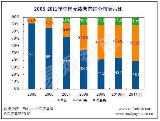 根據(jù)Enfodesk易觀智庫(kù)近期發(fā)布《中國(guó)無(wú)線營(yíng)銷(xiāo)市場(chǎng)專(zhuān)題報(bào)告2010》顯示, 2009年中國(guó)無(wú)線營(yíng)銷(xiāo)市場(chǎng)WAP類(lèi)廣告在無(wú)線營(yíng)銷(xiāo)整體占比達(dá)47.4%,其規(guī)模同比增長(zhǎng)76.8%,與消息類(lèi)廣告同比下跌1.3%相比WAP類(lèi)廣告,已成為無(wú)線營(yíng)銷(xiāo)市場(chǎng)最大推動(dòng)力量。新華網(wǎng)