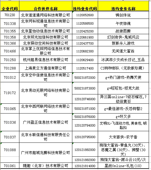 依據(jù)省移動(dòng)公司上報(bào)調(diào)查發(fā)現(xiàn),下列合作伙伴存在違約行為,依據(jù)《中國(guó)移動(dòng)游戲業(yè)務(wù)合作伙伴信用積分管理辦法V2.0》,處理如下:中國(guó)移動(dòng)