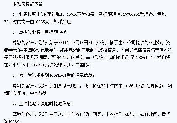 四川移動(dòng)表示,將于今天完成系統(tǒng)改造和上線點(diǎn)播類業(yè)務(wù)的扣費(fèi)主動(dòng)提醒功能。為此,四川移動(dòng)給各大SP廠商下達(dá)了通知,并附上了提醒內(nèi)容。從9月1日期,10086對(duì)于用戶開通的業(yè)務(wù)將會(huì)下發(fā)扣費(fèi)主動(dòng)提醒短信。此外,中國移動(dòng)10086901將受理客戶意見,在72小時(shí)內(nèi)統(tǒng)一由10086人工外呼處理。對(duì)于用戶開通的點(diǎn)播類業(yè)務(wù),中國移動(dòng)設(shè)置了“點(diǎn)播類業(yè)務(wù)主動(dòng)提醒模板”不僅提醒用戶開通了點(diǎn)播類業(yè)務(wù)還為用戶點(diǎn)播過程中出現(xiàn)的問題給出了解決途徑。