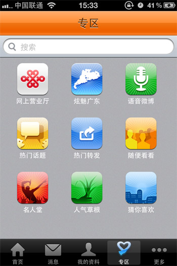 記者在測試中發(fā)現(xiàn),聯(lián)通語音微博整體界面為醒目的聯(lián)通標(biāo)準(zhǔn)色,并內(nèi)置了聯(lián)通專區(qū)、聯(lián)通網(wǎng)上營業(yè)廳、廣東聯(lián)通炫魅廣東等定制應(yīng)用服務(wù)。