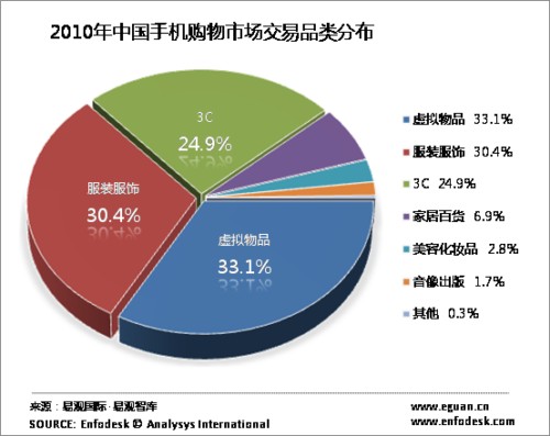 數(shù)據(jù)顯示2010年虛擬交易規(guī)模占比仍然居于交易品類的首位。虛擬交易包括手機(jī)充值、網(wǎng)游充值、網(wǎng)購彩票以及機(jī)票等業(yè)務(wù)。手機(jī)購物的發(fā)展周期特征呈現(xiàn)于PC端電子商務(wù)類似特征,不同的是手機(jī)端消費(fèi)與服務(wù)的便捷性強(qiáng)相關(guān)。易觀研究認(rèn)為,高標(biāo)準(zhǔn)化、便捷性消費(fèi)是首先爆發(fā)的類目,如手機(jī)充值、彩票。未來此類交易仍然會(huì)是手機(jī)購物的主流。