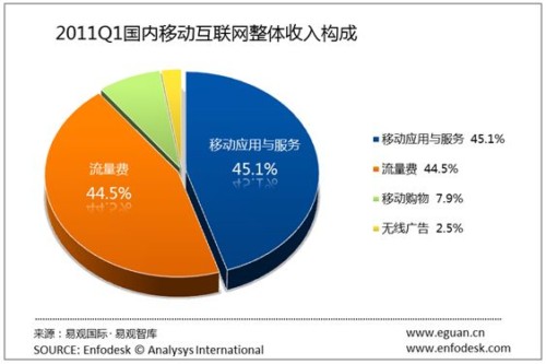 從2011年第1季度移動(dòng)互聯(lián)網(wǎng)收入構(gòu)成,我們發(fā)現(xiàn)移動(dòng)應(yīng)用與服務(wù)仍然是主要營收,占總體市場(chǎng)的45.13%。而流量費(fèi)依然占據(jù)44.45%的份額。而移動(dòng)購物,無線廣告營收占比增長(zhǎng)有限,分別占7.89%和2.52%。