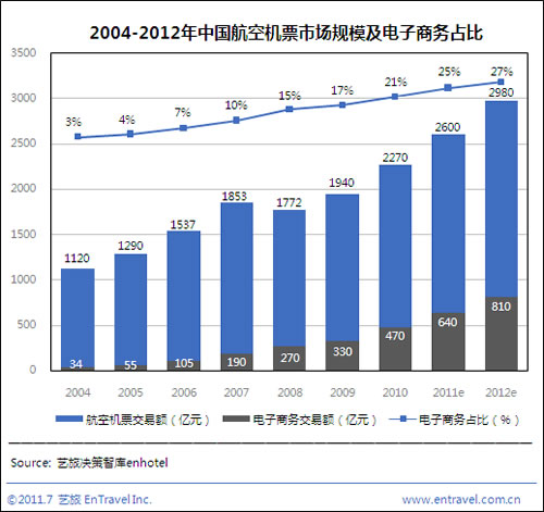 2011年上半年中國機(jī)票電子商務(wù)交易額達(dá)310億元,同期民航機(jī)票交易額為1250億元,電子商務(wù)占比升至25%,距美國45%的滲透率仍有差距。預(yù)計2011全年中國航空機(jī)票電子商務(wù)交易額將達(dá)640億元,而民航機(jī)票交易額將達(dá)2600億元。
