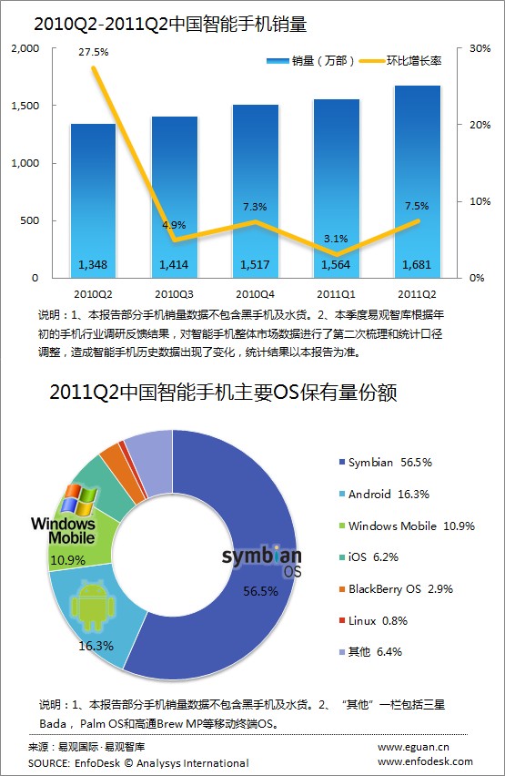 CTI論壇(ctiforum)4月29日消息(記者 潘婷婷):根據(jù)易觀智庫EnfoDesk近期發(fā)布數(shù)據(jù)顯示,中國智能手機(jī)市場2011年第2季度國內(nèi)銷售總量達(dá)1681萬部(不計(jì)黑手機(jī)和水貨手機(jī)),環(huán)比增長7.5%。