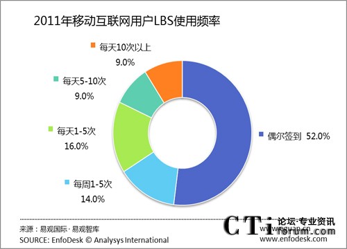 CTI論壇(ctiforum)8月26日消息(記者 張潔):根據(jù)易觀國際(Analysys international)最新調(diào)研顯示,42%的使用LBS用戶認(rèn)為使用應(yīng)用程序可以方便生活,17%的用戶認(rèn)為是社交需求,15%的用戶只是出于追趕潮流的目的,11%的用戶認(rèn)為使用LBS應(yīng)用程序可以獲得一定的優(yōu)惠。