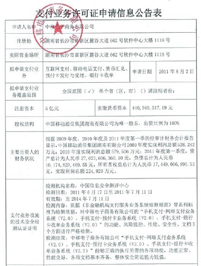 中移動申請支付業(yè)務許可證 湖南移動全資運營