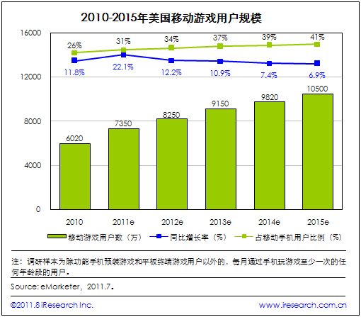 iResearch艾瑞咨詢根據(jù)eMarketer最新發(fā)布數(shù)據(jù)發(fā)現(xiàn),2010年美國移動(dòng)游戲用戶規(guī)模為6020萬人,同比增長(zhǎng)11.8%,占美國移動(dòng)手機(jī)用戶比例為26%;預(yù)計(jì)未來五年內(nèi),用戶規(guī)模將保持持續(xù)增長(zhǎng)勢(shì)態(tài),2011年將出現(xiàn)一個(gè)較高的增長(zhǎng)點(diǎn),移動(dòng)游戲用戶數(shù)將達(dá)到7350萬人,同比增長(zhǎng)22.1%,在移動(dòng)手機(jī)用戶中的滲透率達(dá)31%;之后增長(zhǎng)將逐漸趨緩,到2015年用戶規(guī)模將突破一億,達(dá)到1.05億,同比增長(zhǎng)率降為6.9%,滲透率達(dá)41%。艾瑞咨詢