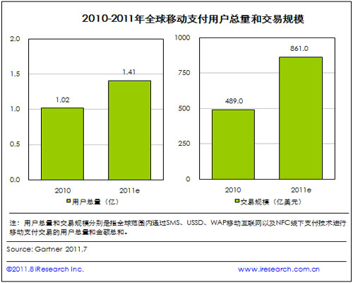整理Gartner的最新數(shù)據(jù)研究發(fā)現(xiàn),預(yù)計(jì)2011年全球移動(dòng)支付用戶規(guī)模將達(dá)到1.41億,較2010年增長38.2%;交易金額也將由2010年的489億美元增長至861億美元,增長率超過76%。該數(shù)據(jù)顯示,全球移動(dòng)支付市場(chǎng)呈現(xiàn)穩(wěn)步增長態(tài)勢(shì),而交易金額的增長速度遠(yuǎn)遠(yuǎn)超過用戶數(shù)量的增長速度也表明人們對(duì)于移動(dòng)支付方式的依賴正在逐步加深。艾瑞