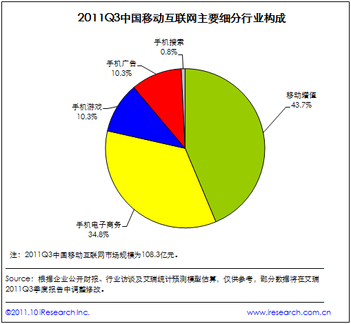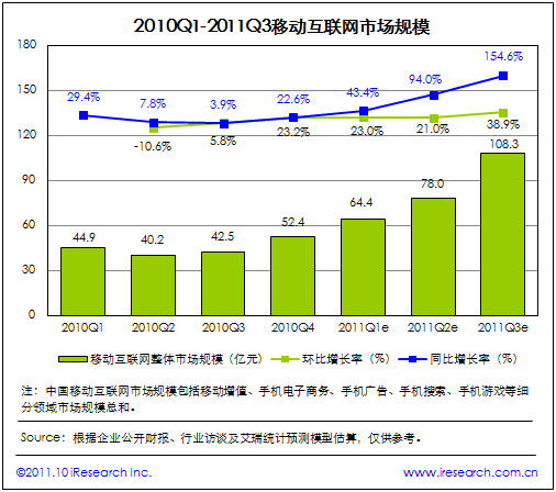 2011Q3中國移動(dòng)互聯(lián)網(wǎng)市場規(guī)模達(dá)108.3億元,爆發(fā)之勢(shì)初顯