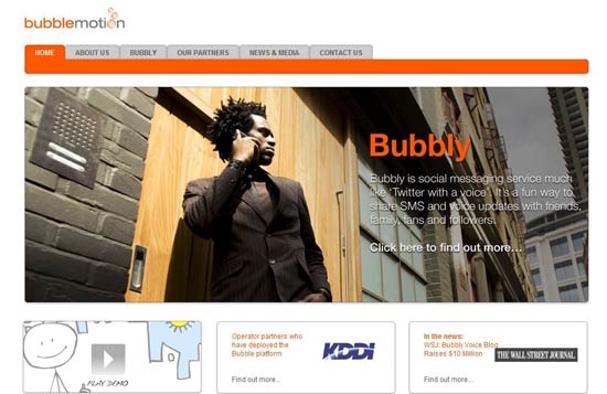 “Bubble Motion”的Bubbly平臺是一個手機(jī)端的語音微博服務(wù),允許用戶通過聲音向他們的關(guān)注者和粉絲發(fā)布狀態(tài)信息,模式與Twitter一樣,只是將文字變成了聲音,微博變成了bubbles,用戶將錄制的聲音更新到手機(jī),然后所有粉絲將收到一條短信通知,點(diǎn)擊短信內(nèi)的鏈接就可以收聽。