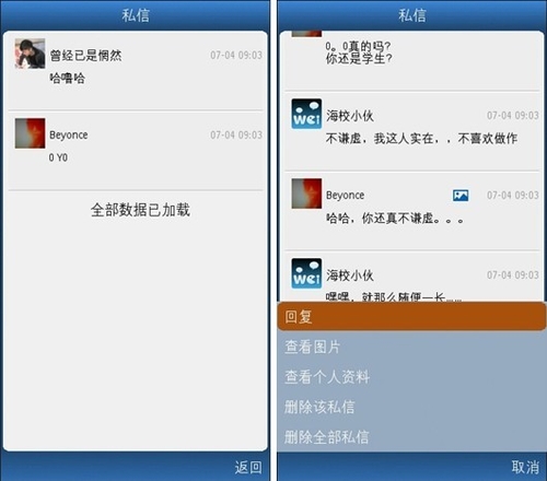 武俠小說(shuō)中每每寫到傳音時(shí),都愛(ài)這樣寫“不世高人傳音入密……”。這不世高人的稱號(hào)可是讓人夢(mèng)寐以求啊。語(yǔ)音微博1.6 for Symbian最新加入的私信功能助你一償夙愿。每每查看其他用戶以及他的語(yǔ)音微博時(shí),你都可以看到私信按鈕,點(diǎn)擊即可發(fā)送私信。傳音入密就是這樣簡(jiǎn)單。當(dāng)然,除了語(yǔ)音,你也可以傳送文字,很貼心有木有。