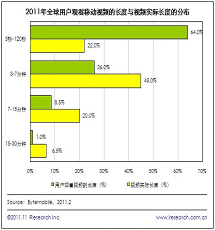 艾瑞咨詢?cè)谘芯緽ytemobile 2011年2月份發(fā)布的全球移動(dòng)視頻研究的報(bào)告中發(fā)現(xiàn),全球有64%的移動(dòng)視頻只被觀看了不超過2分鐘的時(shí)間,而時(shí)長在2分鐘以內(nèi)的移動(dòng)視頻只有22%,也就是說,相當(dāng)多的視頻沒有被完整地看完。艾瑞咨詢