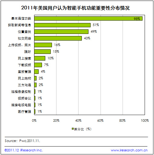 艾瑞咨詢根據Pwc近日發(fā)布的美國移動互聯網用戶演變研究報告發(fā)現,用戶對移動設備的使用和依賴程度增強,同時,通過對用戶使用智能手機功能的調查發(fā)現,用戶認為最重要的功能主要集中在基本通信、獲取資訊信息、位置查找和社交網絡上。艾瑞咨詢