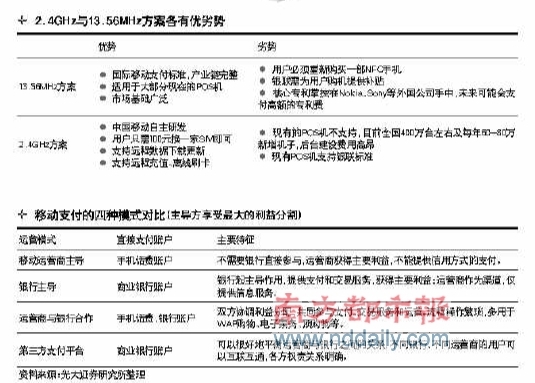 銀聯(lián)青睞的13.56M H z支付方案是國(guó)際移動(dòng)支付標(biāo)準(zhǔn),專利由諾基亞(微博)、索尼等國(guó)際巨頭掌控,國(guó)際上使用較多,發(fā)展較為成熟,廣泛應(yīng)用在交通、金融、社保、加油等非接觸卡片領(lǐng)域,適用于大部分現(xiàn)有的PO S終端機(jī);但其缺點(diǎn)顯而易見(jiàn),首先,用戶使用手機(jī)支付業(yè)務(wù)必須更換為運(yùn)營(yíng)商特制的手機(jī)和SIM卡;其次信號(hào)易受金屬結(jié)構(gòu)影響,為保信號(hào)的強(qiáng)度,手機(jī)后蓋不能使用金屬;再次,其不支持遠(yuǎn)程充值。