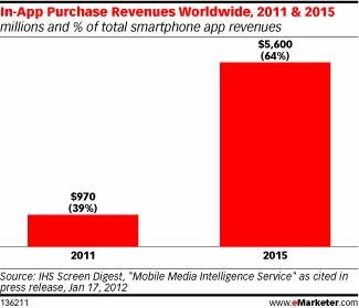 IHS Screen Digest預計,應用內(nèi)置支付將成為移動應用營收的新標準。游戲開發(fā)商共同通過向用戶提供免費應用下載服務,然后向用戶進入新層次內(nèi)容收取費用已證明這種“免費增值”模式非常的成功。IHS Screen Digest預計,到2015年,應用內(nèi)置支付將占據(jù)智能手機應用營收總額的64%,遠超過2011年的39%。