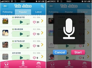Talk Jokes是一款輕量級(jí)語(yǔ)音笑話分享應(yīng)用,鼓勵(lì)用戶通過(guò)真人錄音的方式上傳和分享自己的笑話,專(zhuān)注于“講笑話”的這部分語(yǔ)音垂直市場(chǎng)。