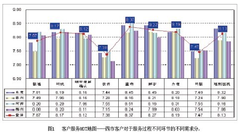 客戶服務(wù)MOT地圖(圖1)——該模塊通過對(duì)10086熱線服務(wù)過程的全景式展示,直觀表現(xiàn)不同地區(qū)、不同品牌客戶在10086熱線服務(wù)不同環(huán)節(jié)上的核心需求,話務(wù)員通過本模塊,可以迅速把握10086熱線服務(wù)的要點(diǎn);