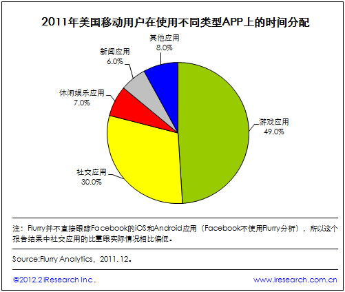 iResearch艾瑞咨詢整理Flurry最新的研究數(shù)據(jù)發(fā)現(xiàn),2011年美國移動用戶花在游戲應(yīng)用上的時間最長,游戲應(yīng)用占據(jù)美國移動用戶應(yīng)用使用總時間的49.0%,其次是社交網(wǎng)絡(luò)應(yīng)用,占30.0%,休閑娛樂應(yīng)用和新聞類應(yīng)用分別為7.0%和6.0%,剩下的其他類型應(yīng)用占據(jù)8.0%。艾瑞咨詢