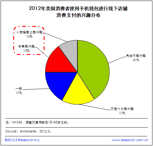 iResearch艾瑞咨詢整理eMarketer調(diào)查數(shù)據(jù)發(fā)現(xiàn),盡管手機支付市場增速迅猛,但其在美國消費者中的接受程度相對較低。數(shù)據(jù)顯示,被調(diào)查者中只有1/4的美國用戶對使用手機錢包在線下店鋪消費感興趣,而相比之下,58%的消費者對手機錢包技術(shù)不感興趣,其中包括41%的人完全沒興趣。艾瑞咨詢