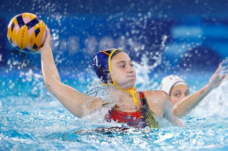 8月4日,西班牙隊球員埃萊娜(左)在比賽中。當日,在巴黎奧運會女子水球小組賽B組比賽中,西班牙隊13比11戰(zhàn)勝意大利隊。新華社記者 張玉薇 攝