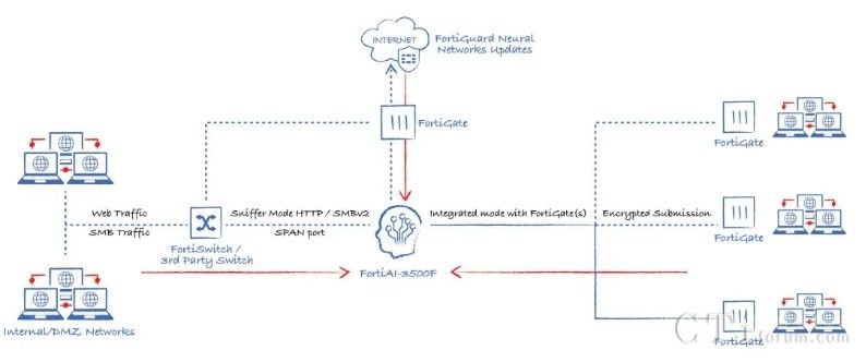 此外,AI技術(shù)還貫穿于Fortinet的多個產(chǎn)品與功能中,形成高效的工作流。以威脅檢測與響應(yīng)為例,當FortiGate的雙引擎也無法確定某個文件的合法性時,它可以將該文件提交給FortiNDR進行深度分析,利用云端深度神經(jīng)網(wǎng)絡(luò)AI進行0 Day攻擊、勒索軟件等深層次分析。若仍無法確定,還可進一步提交給FortiSandbox,在虛擬機環(huán)境中進行模擬操作,進行更為深入的檢測。在這一系列流程與技術(shù)的支持下,F(xiàn)ortinet的威脅檢測與響應(yīng)能力已達到業(yè)界頂尖水平,向滿分100分邁進。