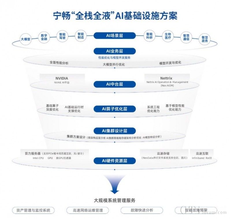 從實際應(yīng)用場景來看,寧暢“全棧全液”AI基礎(chǔ)設(shè)施方案可支持大模型落地所需的計算、存儲、網(wǎng)絡(luò)、建設(shè)、管理、應(yīng)用及液冷等全方位需求,能夠為智算中心的構(gòu)建、以及大模型落地過程中面臨的問題,提供強有力的支持,打造企業(yè)/行業(yè)級智算中心標準方案。