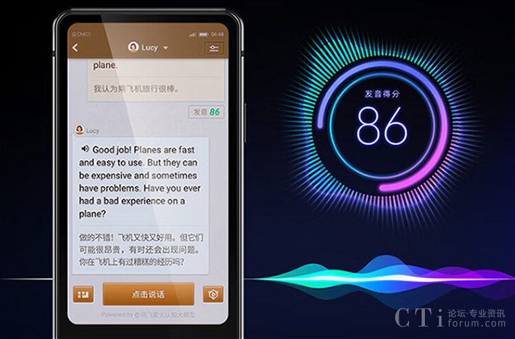 AI教練可以隨時(shí)隨地和用戶一對一地聊天,并會將聊天內(nèi)容用中英文對照的方式顯示在屏幕上,同時(shí)還會對用戶的口語發(fā)音進(jìn)行智能打分。