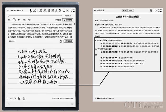 其中會議紀(jì)要功能,可將科大訊飛智能辦公本的語音實(shí)時(shí)轉(zhuǎn)寫功能與墨水屏紙感書寫相結(jié)合,并且可以對會議記錄內(nèi)容形成一份精簡的會議紀(jì)要,有助于快速回溯會議內(nèi)容。