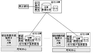 由于銀行在各地建有大量的分支機構(gòu),銀行CRM系統(tǒng)一般都采用分布式數(shù)據(jù)倉庫環(huán)境,即所有分行均擁有自己的CRM系統(tǒng),并與本地綜合業(yè)務系統(tǒng)及呼叫中心連接。在總行建有中心CRM數(shù)據(jù)倉庫,提供面向全行的分析決策功能,并為網(wǎng)上銀行業(yè)務提供數(shù)據(jù)查詢支持。